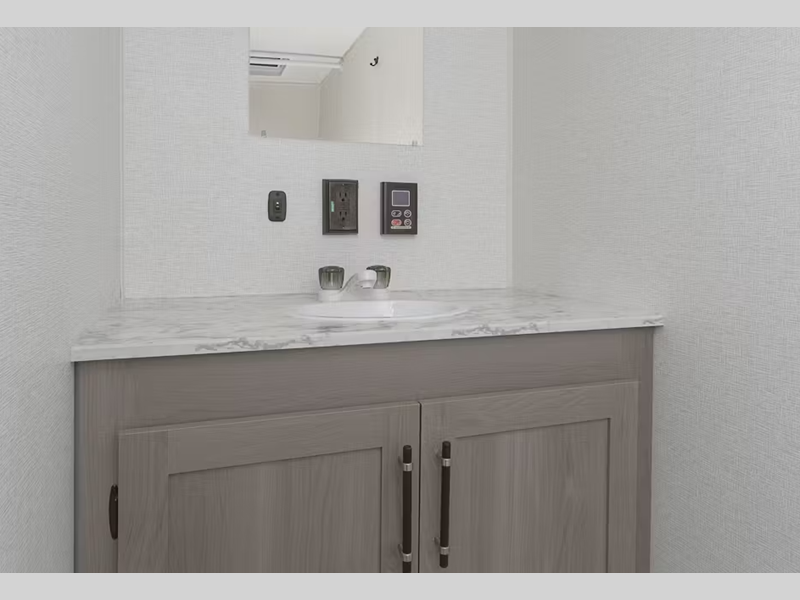 - Vanity storage base with sink and decorative mirror (select models)