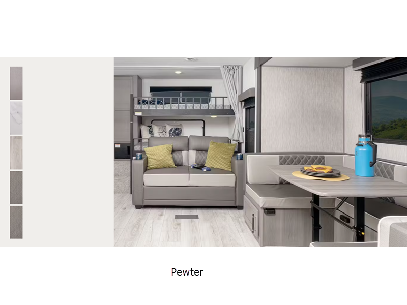 Sleeps 7 Length 22 ft 10 in Ext Height 10 ft 4 in Interior Color Pewter Hitch Weight 495 lbs Dry Weight 3930 lbs Cargo Capacity 4370 lbs Fresh Water Capacity 21 gals Grey Water Capacity 30 gals Black Water Capacity 30 gals Tire Size ST205/75R14D Furnace BTU 20000 btu Number Of Bunks 2 Available Beds Queen Murphy Refrigerator Type 12V Refrigerator Size 7.7 cu ft Cooktop Burners 2 Number of Awnings 1 LP Tank Capacity 20 lbs Water Heater Type Girard On Demand Tankless AC BTU 5000 btu Awning Info 15' Power Axle Count 2 Number of LP Tanks 1 Shower Type Standard Similar Floorplans