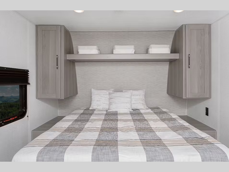 Each model is constructed with an aluminum exterior, tinted safety glass windows, and an 8 foot wide construction for more space. There is a power awning where you can enjoy shade during the day, and the XL entry assist handle will make it easy to come and go. You'll feel right at home with blackout night shades and real wood doors and drawers. A Girard on-demand tankless water heater also comes standard, along with Furrion backup camera prep, a 20K BTU furnace, and more hassle-free camping amenities!